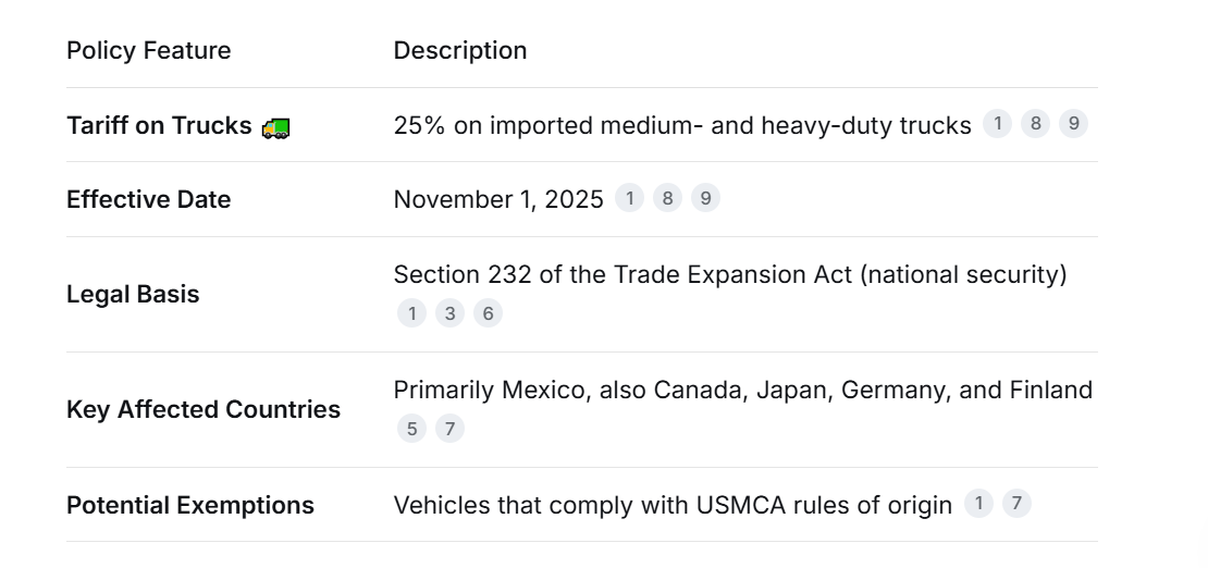 1. Fundamentação da Política: Esta tarifa baseia-se numa investigação da Secção 232 lançada em Abril de 2025, que concluiu que a dependência de camiões importados ameaça a segurança nacional dos EUA e a cadeia logística doméstica. O objetivo é proteger os fabricantes e os empregos americanos.